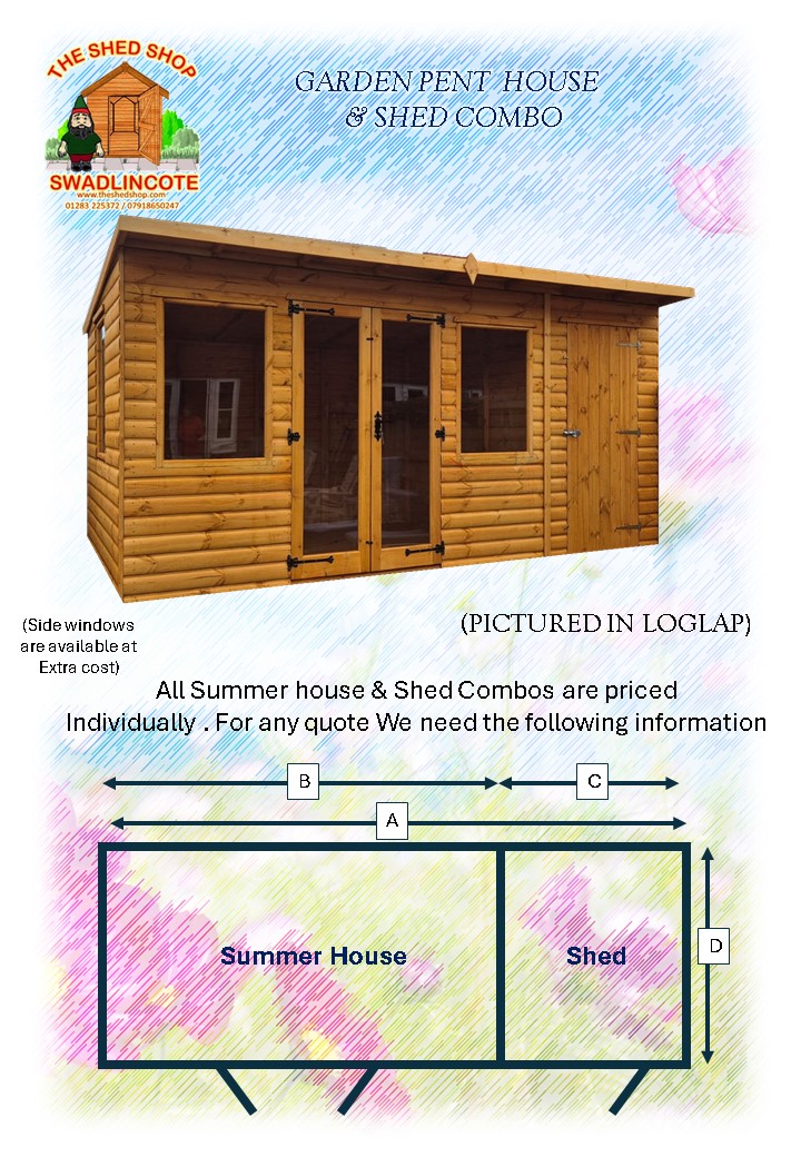 The Summer house and shed combinations are all bespoke and priced individually . Normally these are made by choosing your summer house design and then adding a partition . Doors access to the shed can be either from the external of the building or a door from inside the summer house.