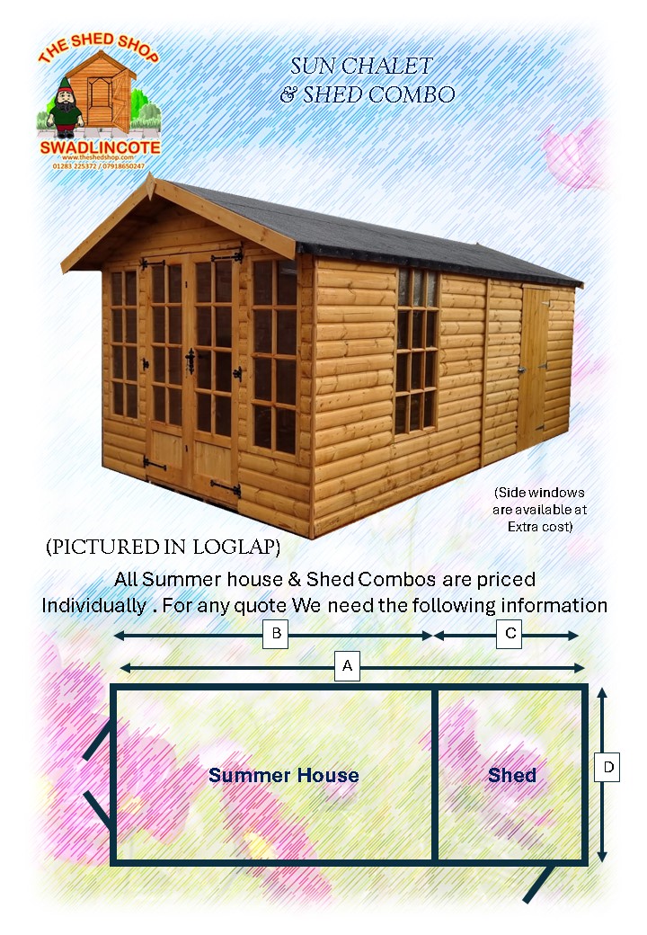 The Summer house and shed combinations are all bespoke and priced individually . Normally these are made by choosing your summer house design and then adding a partition . Doors access to the shed can be either from the external of the building or a door from inside the summer house.