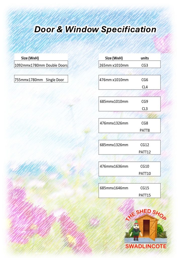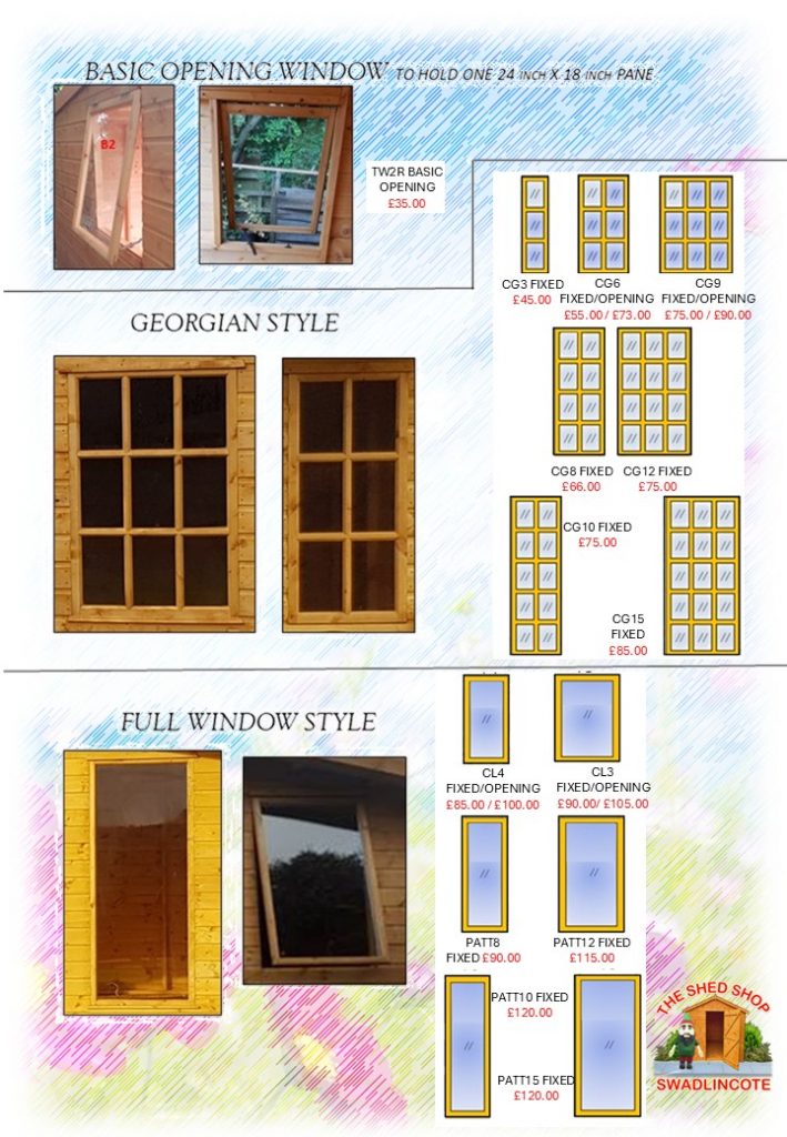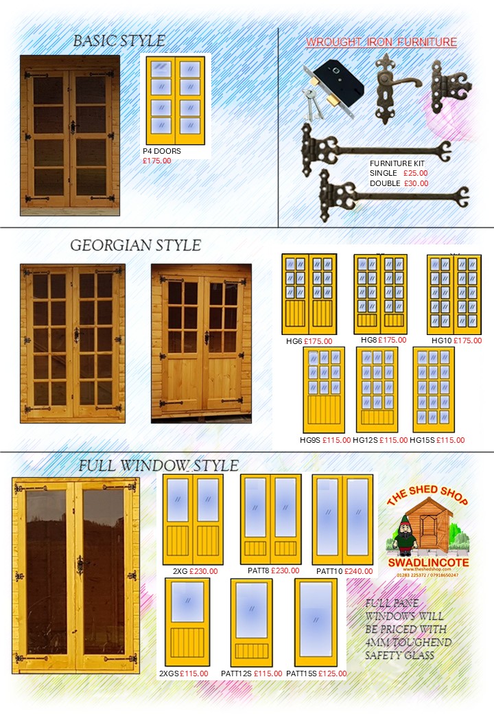 All products are priced with the doors and windows shown in the standard design. You can change any of these or add more from the variations below. For adding extras simply add the cost to the current building. For Alterations take off the price of the current doors and windows then add the new ones. Unsure? give us a call or message and we will be happy to help.